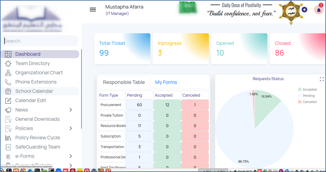 إنها منصة حديثة وآمنة وسهلة الاستخدام، مصممة لتعزيز التعاون الداخلي، وتبسيط التواصل، وزيادة الكفاءة التشغيلية داخل المؤسسات. سواء كان فريقك يعمل من المكتب أو عن بُعد، يوفّر هذا النظام وصولاً مركزيًا إلى الأدوات والموارد والمعلومات الأساسية، مما يمكّن الموظفين من البقاء على اتصال، وعلى اطلاع، وأكثر إنتاجية.